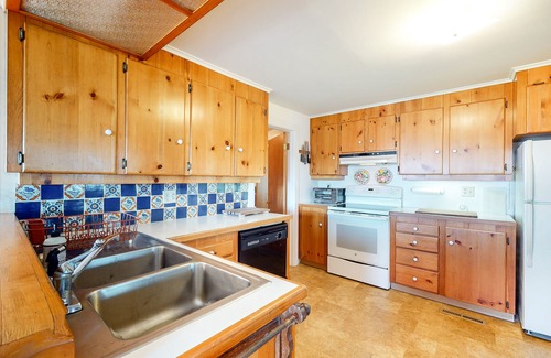 Bike to the Lighthouse or Drift Inn Beach (one of the area’s only public, sandy beaches), then come back home, soak in the private hot tub, and watch the sunset over the spikey, ancient pines of Hupper Island. The front door opens into a small mudroom that leads to the living room, with picture windows overlooking the lawn waterfront. The well-stocked full kitchen offers lots of counter space, perfect for group meal prep. Gather for meals at the dining table, which presents some of the best views in the house. A large dining area is perfect for big meals and can also serve as a great place for putting together puzzles, playing games, or hours of memorable conversation. Find a full bath and laundry room next to the kitchen, while the sitting room off the main living room offers a place to watch the game.