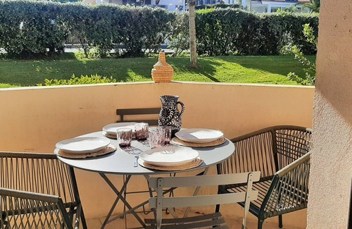 Relax on the balcony (enjoy the outdoor furniture!) of this apartment. As for the great indoors, you can come inside and enjoy the free WiFi and TV.
