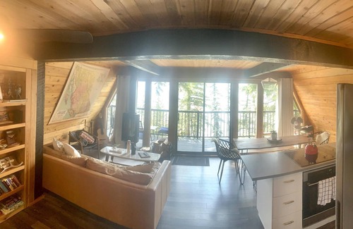 This unique and tranquil A-frame Cabin has 3 beautiful bedrooms and 2 bathrooms, sleeping 6 people comfortably. The loft has an open and airy layout, with a cozy queen bed and your own little sitting area overlooking the lake. The main floor is where your group can gather in the kitchen and living room for some socializing and cook up some good eats, gather around the wood-burning fireplace and step out onto the deck to chill at the patio. The main bathroom with a shower, is also located on the main floor. Off the side entrance of the Cabin is stairs that lead to your other 2 rooms. This lower level has its own separate entrance with one private bedroom that has a queen bed, a set of single bunks in the main area and a bathroom with standing shower.