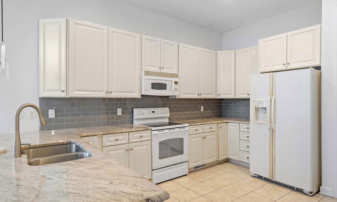 Bayside Founders features a spacious and well-equipped kitchen with ample stone counter space, white appliances, and cream cabinets, creating a warm and inviting atmosphere for cooking and dining. An eat-in area with a table and four chairs provides a cozy spot for casual meals, while additional seating for three at the kitchen counter allows for easy socializing. For larger gatherings, a separate dining room with a table and six chairs ensures plenty of space for enjoying meals together. Whether preparing a family breakfast before a day at the beach or a relaxing dinner after exploring the area, this kitchen is designed for both function and style.