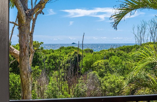 This spacious villa is nestled amongst a private and peaceful bushland setting with ocean views. Downstairs features a well-equipped, open plan kitchen / lounge / dining area, laundry, and a study, as well as a covered outdoor dining setting, BBQ, a large lawn area with secure gate and a sandy track leading directly to the stunning Belongil Beach. Upstairs boasts 2 bedrooms, both with en-suites and private balconies (master bedroom has sea views).