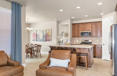 You will enjoy cooking and entertaining in this luxury kitchen. Featuring Stainless steel appliances as well as a side by side refrigerator featuring an icemaker, dishwasher, microwave, oven, and separate gas stovetop. The kitchen is fully stocked. The dining table will seat 8 with an additional 3 bar stools at the bar. The living room has two comfortable couches, a chair, and a large flat-screen TV. You will also enjoy the large covered back patio. The patio has a BBQ, a table and six chairs to enjoy the warm desert breeze.