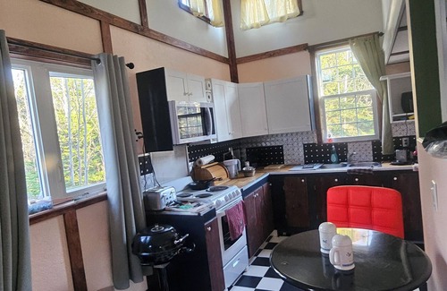 There is a woodstove, washer and dryer, full bath, full kitchen, firepit, and BBQ for your enjoyment.