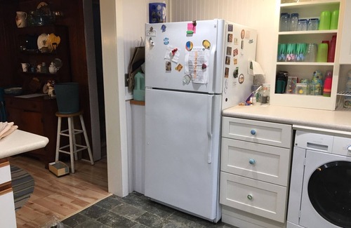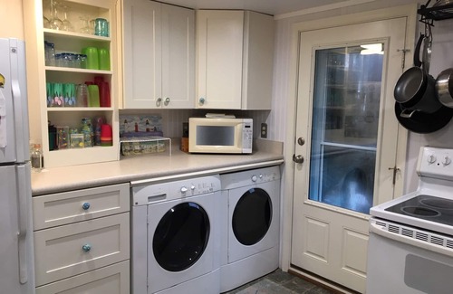 On the main floor there are 2 bedrooms and a bath. (The owner lives in a separate apartment upstairs.) One bedroom has a queen bed and the other has twin beds. The main living room/dining and kitchen are all open and connected.