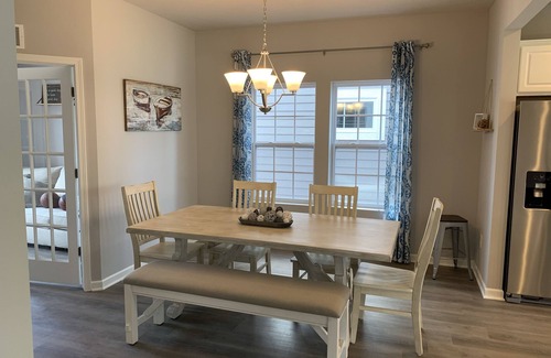 The Main Level is an open concept and spacious- equipped with everything needed to cook for and serve meals to a large group. Play games in the separate den which features a pull out couch (sleeps 2), get comfortable watching movies in the great room, or grill out on the gas grill located on the the back porch. There is a giant fire pit just steps off our back porch -be sure to bring your marshmallows!