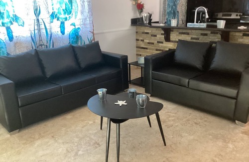 Enjoy a stylish experience at this centrally-located(Hill Top Condominium Complex),2bd/2ba Beach Front Condo at Playa Alicia Beach, Sosua. This Spacious unit has air conditioning in every room with wifi throughout. Enjoy the 65" TV in the living room when not at the beach or the pool. There are two beach Front restaurants within a minute walk for your dining pleasure. There is gated parking lot on the premises for your vehicle. **24 hr Security**