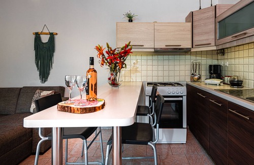 Two luxurious bathrooms, private bathroom for each unit, hairdryer, washing machine. One of the bathrooms is en suite. There is an open plan living/kitchen area, with a large sofa, seats and ceiling to floor windows, that offer an exquisite view of the garden and blue Ionian Sea, comfortable kitchen with full cooker (oven/grill/electric rings), toaster, kettle, coffee machine, big fridge with separate freezer, dining table with chairs, air-co, heating, big wide screen television set, Wi-Fi internet access.