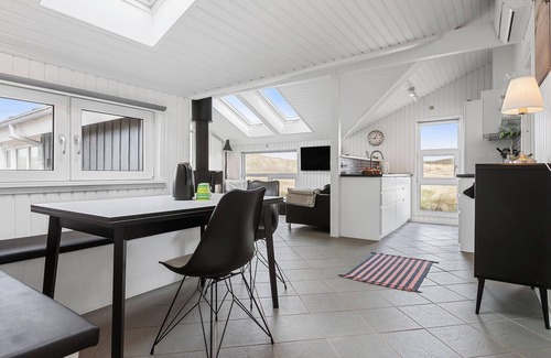 In a fantastic location just a few steps from the beach, this inviting house welcomes you with a beautiful influx of natural light and modern furnishings, where you can make yourself at home during your vacation. After an eventful day, make yourself comfortable in the spacious living area and enjoy the fantastic view through the floor-to-ceiling windows while a fire crackles in the wood-burning stove. A sauna session is particularly soothing after a long walk on the beach, while the activity room offers entertainment options whatever the weather.