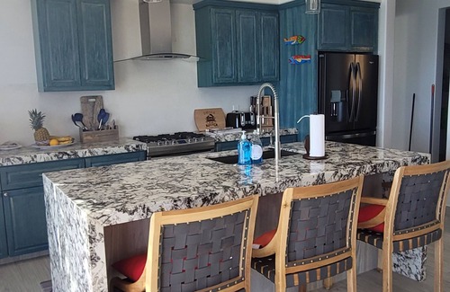 Kitchen amenities of the fully equipped kitchen that has you at home, such as a coffee maker, blender, toaster, 5-burner stove/oven, dishwasher, refrigerator, collection full of pots, pans, knives, plates and cutlery.