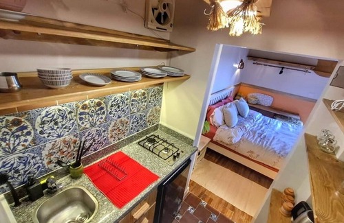 It includes a comfortable bed, private bathroom, a small functional kitchen, and a balcony with a sea view.