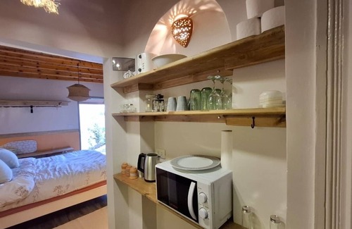 The kitchen has a stove, microwave, toaster, kettle, fridge, cookware, dishes, basic spices, tea, coffee,