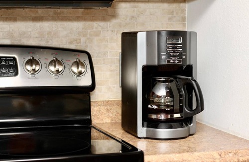 Plenty of place settings including drinking glasses, wine glasses, coffee mugs plus kid friendly dinnerware, pots and pans, cooking utensils, mixing bowls, baking dishes, pizza pan, blender, griddle, can opener, wine opener, measuring cups and spoons, coffee maker (including complimentary coffee, filters, creamer)