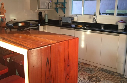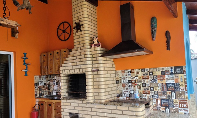 Social bathroom, american style kitchen equipped with stove, refrigerator, microwave oven, utensils for kitchen and barbecue, parking for 03 cars, large balcony with barbecue and wood oven.
