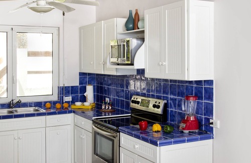 The upper level offers stunning views from the living, dining and kitchen areas and has a 1/2 bathroom. The villa boasts a custom kitchen with modern stainless steel appliances and brightly colored blue tile which nicely compliments the white shutter cabinet door. The living and dining areas are truly indoor/outdoor. The entire wall of the villa facing the pool and sea is made of sliding doors that open almost the entire wall of the villa facing the pool and sea is made of sliding doors that open almost the entire length of the wall creating spectacular views from everywhere on the upper level of the villa.