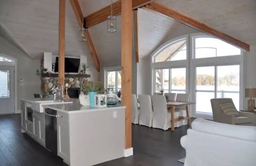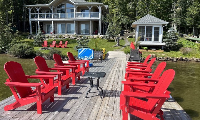 This 3 bedrooms, 2 bathrooms, 2 level, 3,300 sq. ft. cottage is located on a shallow sandy waterfront. With a huge Dock for the whole family. 1 canoe, 2 Adult Kayak, 2 child Kayaks and 1 paddle board.