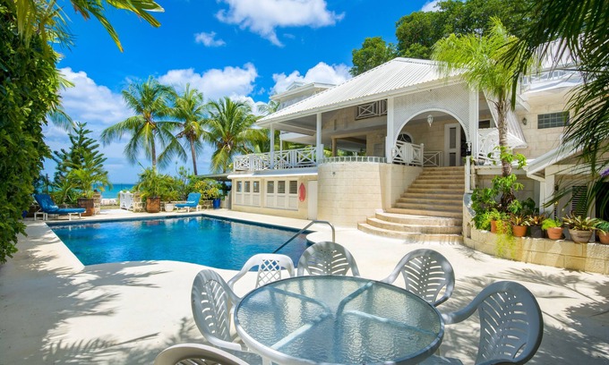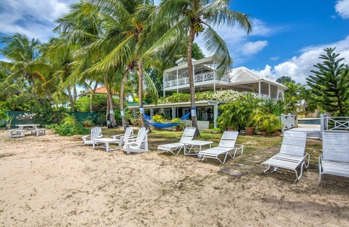 Tantalus Villa, Brighton Beach, St. Michael, is a luxurious beachfront property along the West Coast of Barbados. The property has a five bedroom suites on the upper two levels of the main house. It is a beautiful residence with high quality coral stone finishing and flooring throughout. The total area is approximately 4200 square feet on the upper two levels with large balconies on both levels. Each bedroom is fully air-conditioned and equipped with ceiling fans as well.