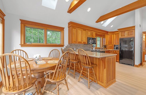The second level (upper level) includes a large kitchen with microwave, full size fridge, dishwasher, stove with oven, toaster, kettle, Keurig coffee maker. We have stocked the kitchen with ample dinnerware, glassware and utensils and more.