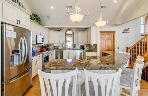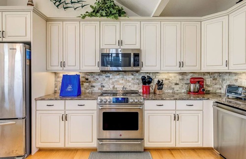 Inside, this multi-level home, with an elevator for easy access to all floors, has been refreshed with updated décor and quality furnishings throughout. The top floor welcomes you with a sunlit, open layout that includes vaulted ceilings, cozy seating, and space for the whole group to relax and reconnect. Cooking and cleanup are a breeze in the comfortable kitchen, complete with granite countertops, stainless steel appliances, and two dishwashers to handle family meals with ease. There's even a second laundry closet to make one-level living easy, too!