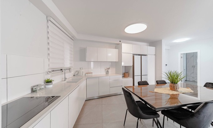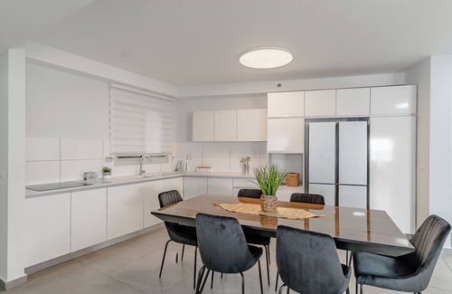 Nestled in Ashkelon, this delightful condo offers 5 cozy bedrooms, with amenities like WiFi, heating, AC, a washing machine, hair dryer. The 3 bathrooms are equipped with all the essentials for a comfortable stay. Whether you're traveling with family or friends, this lovely property is the perfect place to relax and unwind. Overlooking the beach - 10 minute walk, cozy, spacious, and includes shopping center at the bottom of the building, private parking and street parking, located in a new high rise on the 11th floor, with stylish lobby and elevator access, well maintained. No Pets Allowed. Central Location in Ashkelon. Nearby playground. Shabbat elevator available