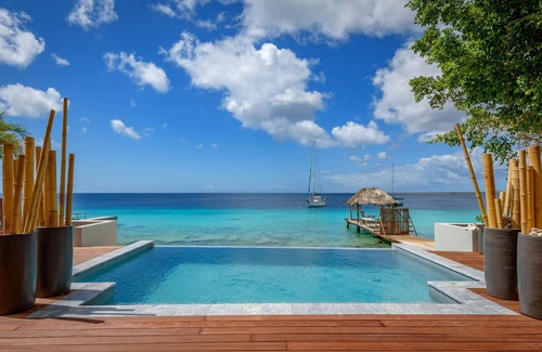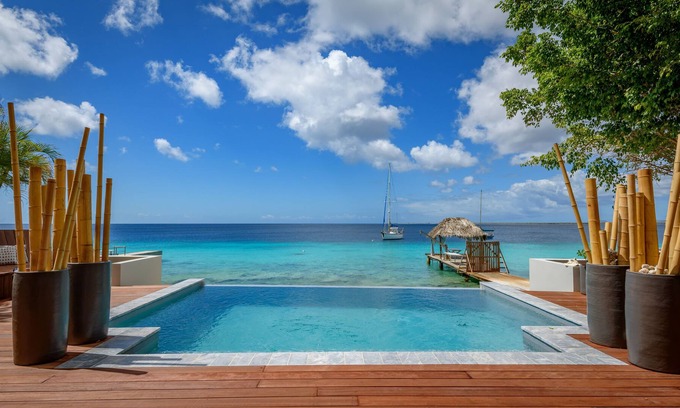 A brand-new oceanfront villa close to the city center of Bonaire. Villa Seru di Santu is the perfect accommodation for two families or a group of friends. The Villa consists of two floors with a private entrance. Each floor benefits from a well-equipped open kitchen, dining and living space with an amazing view over the calm Caribbean Sea. On both floors a total of six people can be accommodated and features three king-size bedrooms. The bedrooms all have their own private en-suite bathrooms and views of the surrounding area. All rooms are equipped with bed linen and towels and an adjustable air conditioning system. The Villa is surrounded by a beautiful tropical garden with a lounging space and a big dining table next to the pool area. This is the infinity pool blends perfectly together with the ocean and provides the perfect way to cool off when it gets too hot. The two stairs next to the pool give you a refreshing swim in the ocean. The villa also features the possibility of a scuba gear, an outside sun bed with an ocean view and a big sun bed to relax.