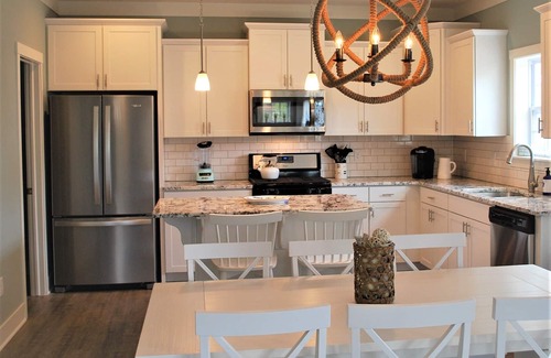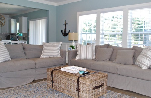 This large, brand new, two story cottage with completed lower level is a spacious 3,060 sf. It has 6 bedrooms, 4 baths and is finished in a warm and relaxed décor with an open concept floor plan that’s perfect for getting a large group together. It features comfortable, quality furnishings, a gas fireplace, a fully equipped kitchen with stainless appliances and an outdoor gas grill and patio furniture. It also has satellite television, WIFI, DVD players, front and back porch, central A/C, washer/dryer and plenty of linens. There is a first floor bedroom suite with queen poster bed, TV, and full bathroom. Upstairs there are 2 king bedrooms and 2 guest rooms with 2 twin beds and 1 trundle bed in each. Rec room in basement including: electric fireplace, pull out sofa, large screen TV, convection microwave and small refrigerator. A sixth bedroom and full bathroom are in the basement as well. The flexible lay out allows the home to sleep up to 16 guests.