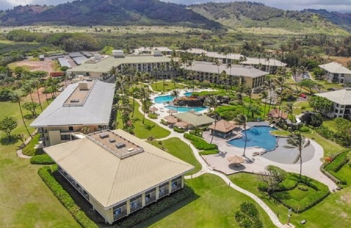 The Outrigger Kauai Beach Resort and Spa is a beautiful Hawaiian plantation-style resort located on 25 acres of lush Garden Isle, centrally located between Kauai’s south and north shores, making it perfect for your island adventures. Only minutes from the airport, Costco, Walmart and Shopping. You will go thru a tree canopy lined drive that leads to the resort. Several acres of beach front property to enjoy and explore. On property there are four swimming pools, complete with water falls, a poolside cabana bar and grill, two jacuzzies, fitness center and day spa. Paradise will be your back yard!