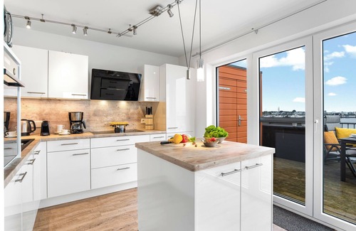 The kitchen, which connects directly to the living area, is also open. Here our guests can expect a dining table with comfortable seating and a fully equipped kitchen with a kitchen block in the middle of the room. The large panoramic windows offer a great view of the Baltic Sea port - let your eyes wander over the water and let your mind wander. From the kitchen you enter the large roof terrace, which is equipped with a comfortable lounge sofa (from summer 2019). From here you can watch the ships come in and out at the sundowner or spend a nice barbecue evening with family or friends - here you can fully enjoy the Baltic Sea flair. A guest shower room is also available on this living level.