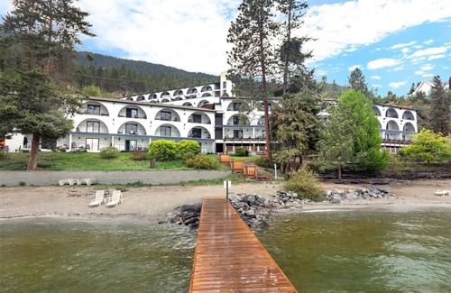Carved into the side of the mountain 20 minutes away from the beautiful city of Kelowna, this chic style condo is beach front on world renowned Okanagan Lake! Take in the gorgeous sunrise over the water while sipping your morning coffee from the living area or deck.