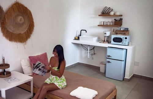 Take it easy at this unique and wonderful getaway. Suite 205 at Corcega Beachfront Suites has a plush queen size bed, two twin beds, a luxurious bathroom and quaint kitchenette. The best part of it is that this apartment is just a few steps away from the sea!