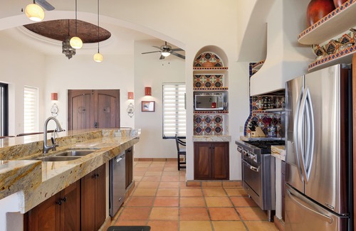 The veranda spans one entire side of the house, with fantastic views of the Sea of Cortez. This is where the pool and gas fire-pit are located, where you can spend many relaxing hours during the day and night. A sun sheltered outdoor dining area is another option for enjoying the tranquility of Hacienda del Sol. If you enjoy cooking on the BBQ, there is a large outdoor gas grill only steps away from the kitchen.
