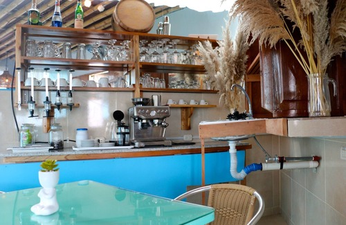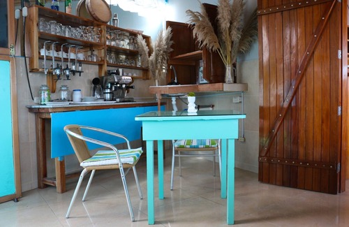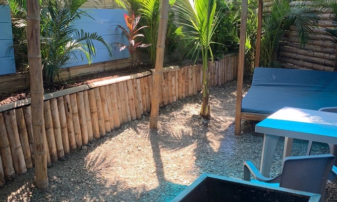 With over 25 meters of high windows, you enjoy the best view of Olon from your 2 bedrooms, frlm the living room, from the kitchen & relax areas. Equipped with reading corner, bar area and it even has a cute garden with covered areas, big trees with tropical birds, a covered garden bed(queen sized as well!) and an extra exit, bike rack, foot shower, seating etc.