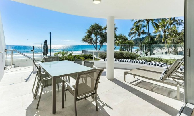 The modern kitchen is well-equipped with ample bench and storage space. The open-plan living area oozes cosmopolitan coastal style, with sumptuous leather lounges perfect for relaxing on, at the end of the day. From here step out onto the terrace which directly overlooks the beach and shared pool. Fully retractable doors can be pushed back to take full advantage of the ocean vista. Take a front-row seat and watch the world go by from the comfort of the daybeds. Or stroll out directly onto the beach for a dip in the ocean. Enjoy sunrises and sunsets and even the odd dolphin if you're lucky. You can't get any more central than this!