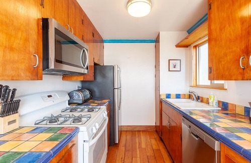 Kitchen is fully equipped with tile countertops and a gas stove/oven, microwave, coffeemaker, fridge, toaster and water kettle. Plenty of cookware and dinnerware included.