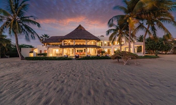 Boasting unique features such as its artfully crafted handmade dining table and two-tiered palapa roof, this expansive estate is a standout along the coast.