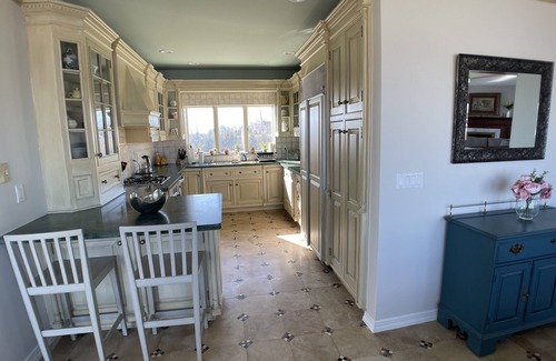 The main floor is anchored by two elegant parlor rooms on each side of the house, one featuring earth-toned sofas, dark-wood furniture and deeply hued carpets, while the other is a cheerfully decorated room facing towards the east which fills with light from the moment of sunrise. Between the two parlor rooms is a large dining room with an adjoining kitchen, with the long ivory birch dining table matching the kitchen's cabinets. Countertops are emerald-green granite, and the gas-powered range and stove are fully available for your use. As you dine, your view will be of the azure ocean, which you can enjoy even more closely from the veranda immediately outside the dining room, accessible through glass doors from either of the parlor rooms. The basement are not part of this agreement.