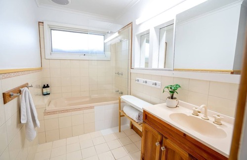 Three bedrooms have queen-size beds, with the generous primary bedroom featuring a full ensuite. In the main bathroom you’ll find an overhead shower, plus a bathtub where guests can indulge in a leisurely soak, along with all the essentials – soap, shampoo, conditioner and a hairdryer.