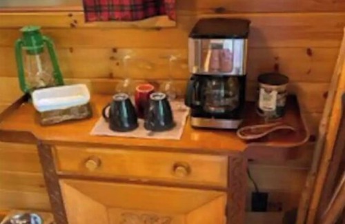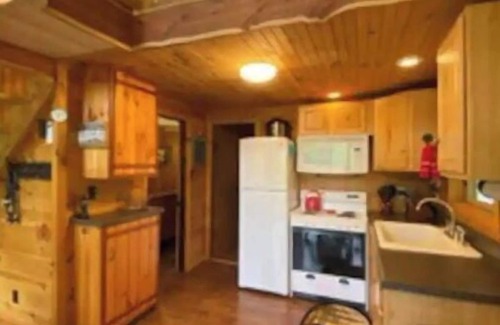 The cabin is warm and inviting. You can bring your pet for an additional 40.00 fee. There is plenty if room to roam around the cabin and take a walk with your dog if you like. There is a firepit area down in the front of the cabin if you want to roast some hotdogs or make some smores, or just sip and chill. The deck has a grill and is a great place to enjoy your morning coffee as you plan your days activities. The interior is all beautiful tongue and groove pine with a cathedral ceiling , living area with gas log fireplace that operates off a remote adjoined by a dining area with a coffee/wine bar that opens into the full kitchen . Off that area is a bedroom with a new queen bed with a dresser and closet. There is also a full bath with a shower/tub combo. Up in the loft is another new queen bed with a dresser - just watch your head if you are tall...the center of the room is about 6 ft or so. Great area for the kids!