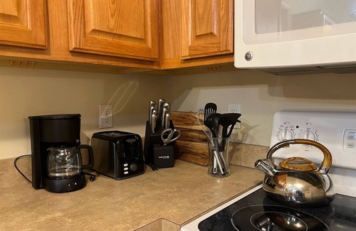 This spacious 2 bedroom, 2 full bathroom condo sleeps 5. There are 3 twin beds in one bedroom and king bed in the primary suite. Fully equipped kitchen, wifi and fire TV are available for you. The rear deck offers serene wooded views and easy access to the slopes – the closest ski lift is just 100 steps away. Ski/snow board racks are available by both entrances. Please do not bring your skis inside.