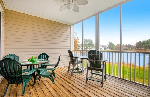 Take in pond views from the screened porch and deck of this first-floor, golf villa-style condo! Featuring approximately 1,420 square feet of vacation space for your next beach adventure, this one-level resort getaway features a living and dining area, a well-equipped kitchen, a full hallway bathroom, and two bedrooms, including a primary suite. Enjoy central air conditioning, a washer/dryer, two TVs (including a 40-inch Smart TV in the living room and a 37-inch flatscreen TV in the primary bedroom), free WiFi, a Keurig, a gas fireplace.