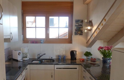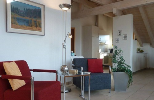 The modern, spacious attic apartment in the Alpen-Träumli house invites you to linger: on the spacious balcony (23m2) you can enjoy a wonderful view of Lake Thun and the mountains of the Bernese Oberland with the Eiger, Mönch and Jungfrau. The apartment is very quiet. Depending on the season, it is even possible to observe wild animals (deer, foxes, chamois, ibex). The living area is cozy. The visible roof construction and the comfortable armchairs and sofa contribute to this.