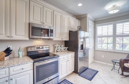 The LARGE kitchen has upgraded 42-inch cabinets, stainless appliances, granite countertops, and under-cabinet lighting. This property has more counter space than any other townhome model in Paseo. It contains all appliances, utensils, and equipment you will need to prepare any type of meal. We have place settings for 12, heavy flatware, a knife set, upgraded cookware, bakeware, insulated cups, wine glasses, corkscrew, high ball glasses, shot glasses, large hydro flask thermos, Keurig coffee maker for individual K-cups or 10-cup pot, air fryer, spatula and tongs for the grill, Tupperware, serving dishes, measuring cups and spoons, vegetable chopper, egg cooker, and more!