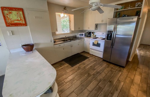 This wonderful 3 bedroom, 2 bath for 8 Kekaha beach house, is located just 200 yards to the beach, just blocks from fabulous Kekaha Beach park, and just a 7 min drive to the road to the famous Polihale Coast! Kekah gets the least amount of rain in all of Hawaii, yet its only a 5 min drive to the road up to Waimea Canyon! The home surrounded by palms and gardens, offers a spacious backyard patio, and large fenced in yard! Amazing location to see the Napalai Coast, Waimea Canyon, Polihale Coast, Salt Pond Beach, and take a trip to Poipu for the day as well. 2 kings, 2 twins, 1 sleeper sofa