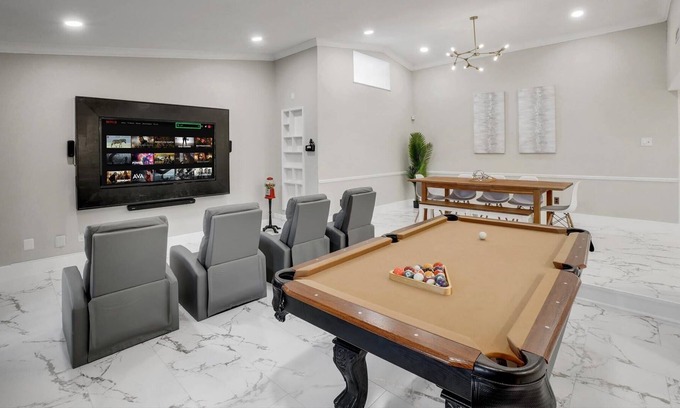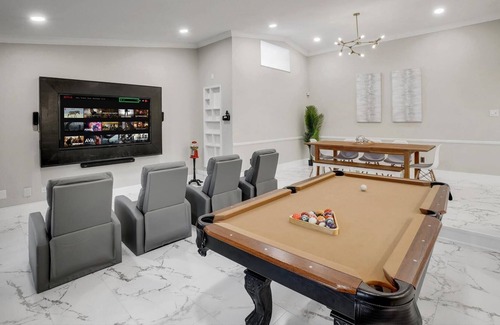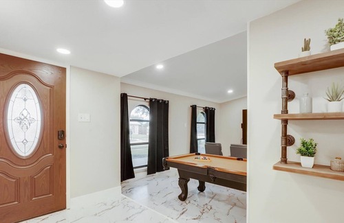 This amazing remodeled one story house Located in Carrollton quiet and save neighborhood has 5 Bedrooms, 2.5 Bathrooms with a private Pool and Patio area. The backyard has a covered patio area, grill, a little bar, and patio furniture.You and your guest welcome to use the outdoor shower by the pool, Inside you will find an amazing Game Room with pool table. Easy for wheelchair, you'll find a large fully equipped kitchen...You will enjoy watching a movie in the cinema room