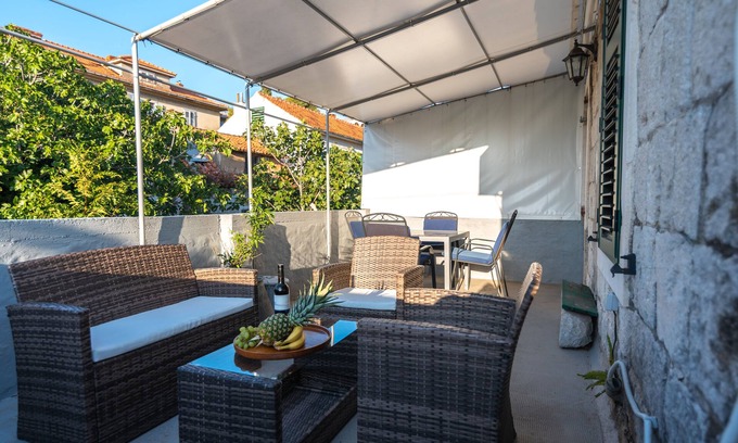 Beautiful antique apartment in center with terrace & sea view. It has 2 bedrooms with double beds and TV in booth rooms, kitchen and living room, bathroom and big terrace with sitting area. Apartment in uniquely decorated with mix of Split tradition and modernism. Also view from the terrace offers great view on old town, Diocletian palace and sea.