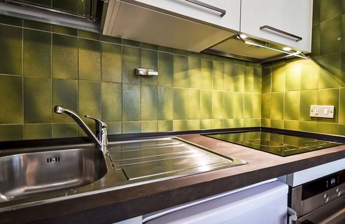 The apartment comes fully equipped with modern conveniences including a washing machine, television, and heating system with boiler. The kitchenette features an oven, 4 induction hot plates, kettle, microwave, and an electric coffee machine with complimentary Nespresso capsules. For families traveling with young children, a high chair and baby cot are provided. The unit includes WiFi internet access at no additional cost. The maximum capacity is 3 persons, with one bedroom and one bathroom available for your use.