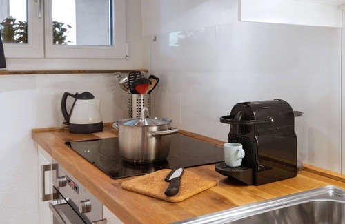 The open kitchen is well-equipped with an oven, dishwasher, 4 induction hot plates, toaster, kettle, electric coffee machine, and a raclette grill and fondue set (cheese). Capsules for the coffee machine (Nespresso) are available at an extra cost. The bathroom has a bathtub and a toilet. The balcony measures 7 m2 and is furnished with balcony furniture and deck chairs (2). The apartment offers a side view of the mountains and the countryside.