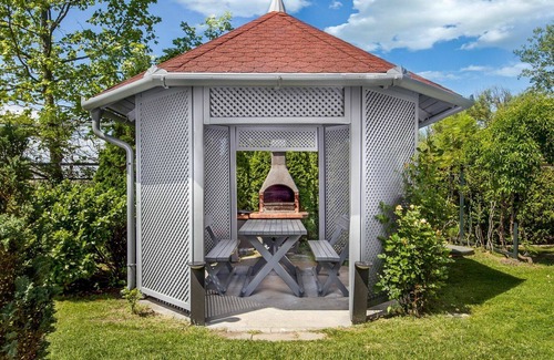 Balatonmáriafürdő: Modern, cosy house. In a sunny position, 70 m from the lake. For shared use: well-kept garden (fenced), lawn for sunbathing, swimming pool angular (7 x 4 m, depth 120 cm, seasonal availability: 01.May. - 01.Oct.) with internal staircase. Pergola, garden furniture, barbecue (swing). In the house: WiFi, air conditioning (extra). Grocery 1 km, restaurant 180 m, grass beach 70 m. Please note: Additional accommodations can be booked.