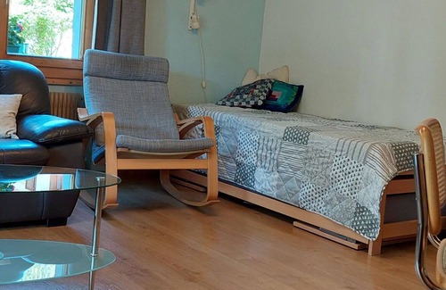 1 bedroom with 1double bed (180x200cm). Living-/dining room with1 single bed and 1 trunde bedfor 2 persons. Separate kitchen with microwave oven,Nespresso coffee machine as well as filter coffee, fondue- and raclette-set. Shower/toiletandWLAN. Baby cot (60x120cm) incl. bed linen and highchair available.