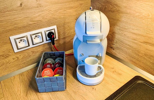 The kitchenette is equipped with an oven, dishwasher, kettle, microwave, and an electric coffee machine.