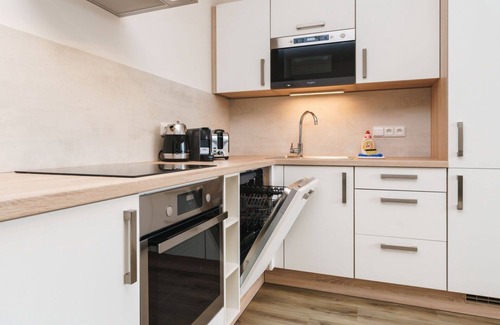 Your 3-room apartment, spanning 68 square meters, is situated on the 1st floor and offers ample space for your vacation. The living room features a double sofabed, ensuring comfortable accommodation for additional guests. There are two separate bedrooms, one equipped with a double bed and the other with a double bed as well. The well-appointed kitchenette comes complete with an oven, dishwasher, microwave, and an electric coffee machine, complemented by a dining table and TV.
